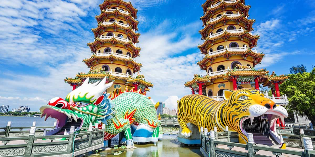 - Tháp Long Hổ – Là một trong những ngôi chùa có kiến trúc đẹp nhất ở Đài Loan. Ngôi chùa có hai tòa tháp chính là tháp Long và tháp Hổ, mỗi tháp cao 7 tầng, cửa ra vào được thiết kế độc đáo với một bên là Rồng, một bên là Hổ với ngụ ý vào Rồng ra Hổ tượng trưng cho cát tường, thịnh vượng và may mắn.