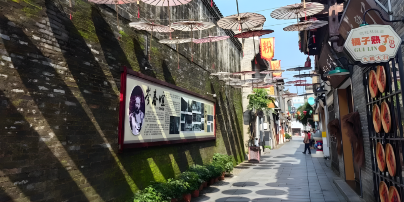- “Làng Phong Tục Dân Tộc Thiểu Số” Trên con phố cổ nhỏ, lát đầy các viên đá màu xanh, hai bên là những ngôi nhà xưa được bảo tồn gần như nguyên vẹn. Dọc theo lối đi là các căn nhà chủ yếu xây hai tầng bằng gạch màu xanh, mái ngói xanh theo kiến trúc thời Minh – Thanh, dấu ấn thăng trầm lịch sử hiện hữu khắp nơi.